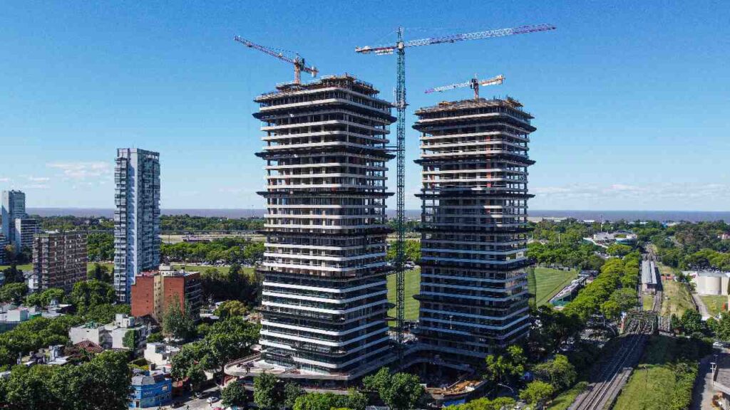 La obra avanza a paso firme con trabajos que incluyen la estructura de hormigón en su etapa final, instalaciones y la colocación de fachadas vidriadas, mientras que en el piso 30 ya se ejecuta el remate del edificio.