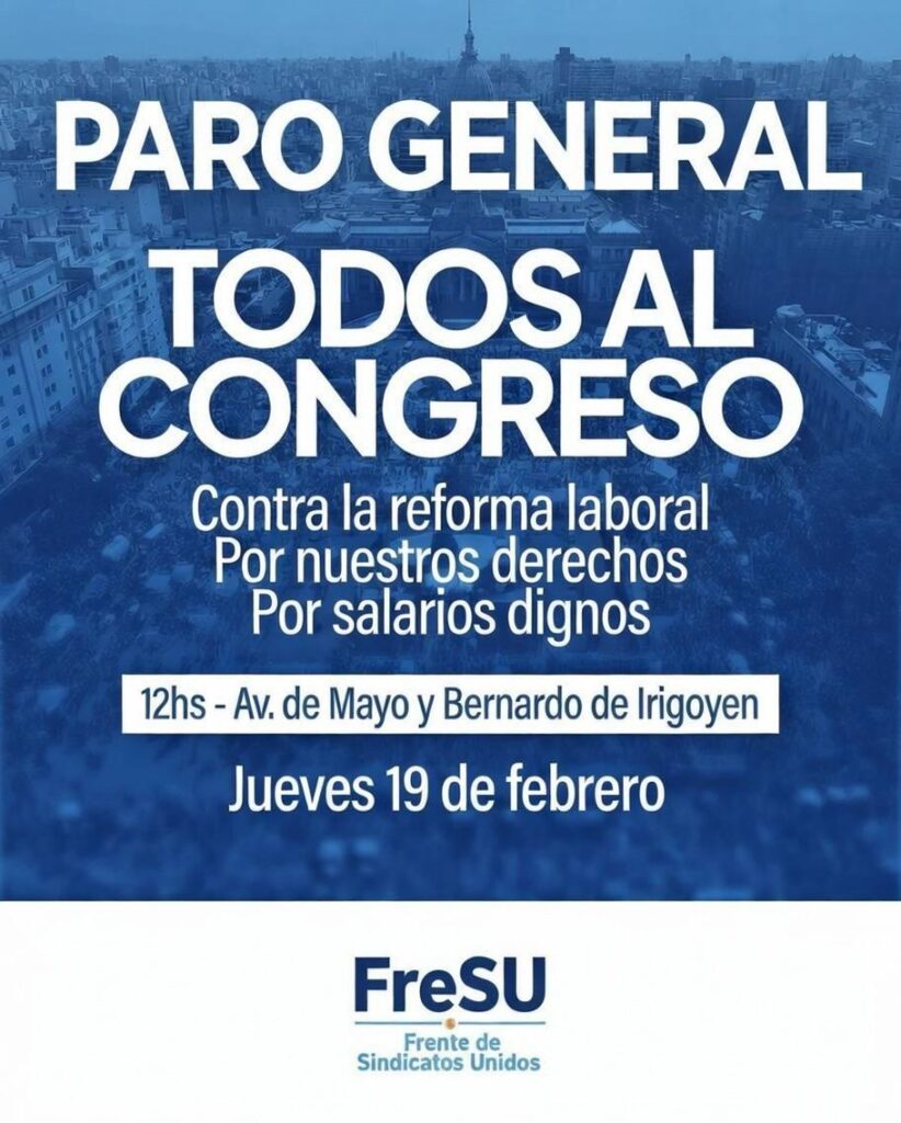 La convocatoria la confirmó InfoGremiales en exclusiva. Ya comenzó a circular por los celulares de los dirigentes del espacio. El Frente de Sindicatos Unidos y la UOM, como punta de lanza, convocan a un paro con movilización este jueves 19 de febrero, día que se espere llegue a la Cámara baja la Reforma Laboral.