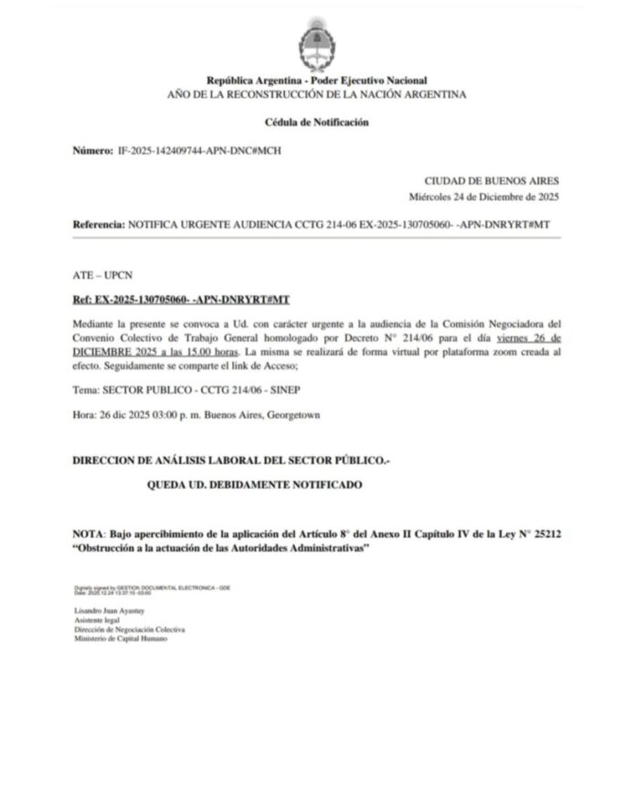 La cédula de notificación formal llegó el miércoles, tras la nota de InfoGremiales. El Gobierno convocó a paritarias para este viernes 26 de diciembre a las 15:00. Se encamina a cerrar la paritaria de estatales nacionales con un 2% de aumento y un bono de $50 mil pesos.