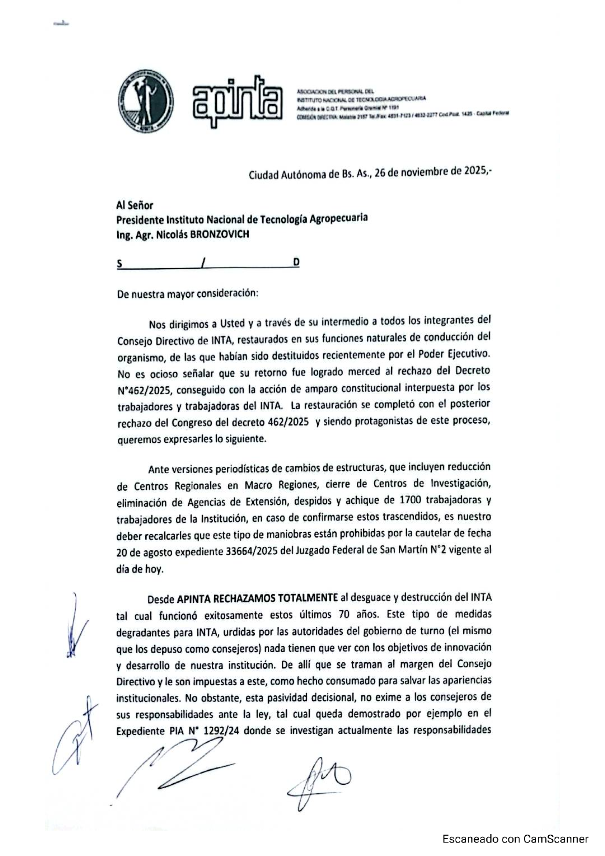 En el caso de APINTA, la carta dirigida al presidente del INTA y a todos los integrantes del Consejo Directivo, “restaurados en sus funciones naturales de conducción del organismo, de las que habían sido destituidos recientemente por el Poder Ejecutivo”, recordó que además de la ley dictada por el Congreso -que devolvió al INTA su autarquía- está vigente una medida cautelar de la justicia dictada el 20 de agosto (expediente 33664/2025 del Juzgado Federal de San Martín 2), que prohíbe al gobierno hacer modificaciones administrativas por un plazo de 180 días.