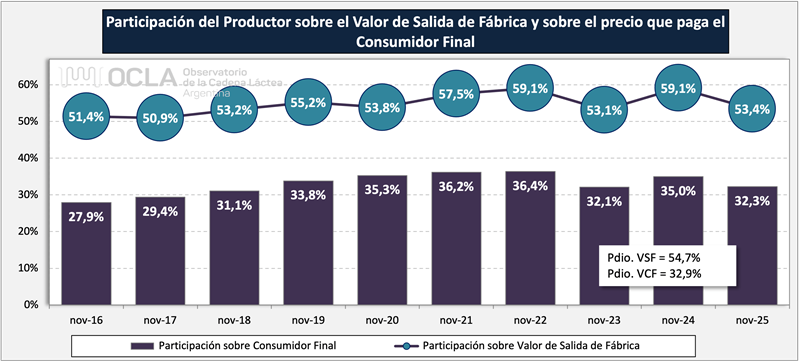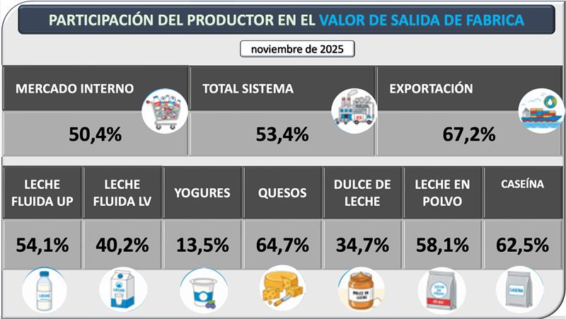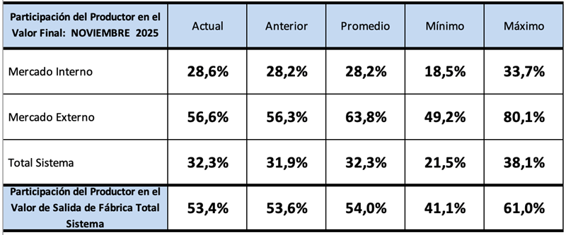 La participación del productor en el total del sistema fue para noviembre de 2025 del 32,3%, 0,4 puntos por encima del mes anterior, 2,7 puntos por debajo del año pasado y exactamente igual que la media del 32,3%. Los valores finales de mercado interno subieron 0,4 y los de mercado externo 0,3 puntos porcentuales, respecto al mes anterior. En el interanual baja 1,4 puntos en el mercado interno y 15,9 puntos en el externo. La participación del productor sobre el valor de salida de fábrica (precio al que vende la industria) fue de 53,4%, 0,2 puntos por debajo del mes anterior, 5,7 puntos por debajo del año anterior y 0,6 puntos por debajo del promedio de la serie (54,0%).