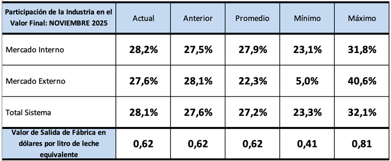 La industria mejoró 0,5 puntos porcentuales en noviembre de 2025 su performance de participación en el total del sistema (28,1%), aumentando levemente la participación en el mercado interno (0,7) y disminuyendo 0,5 puntos en el mercado externo, todas respecto al mes anterior. La facturación total de salida de fábrica por litro de leche equivalente estuvo en US$ 0,62 (igual que el mes anterior) y US$ 0,12 menos que igual mes del año anterior, igual que el promedio de la serie disponible y a 19 centavos del máximo logrado en mayo y octubre de 2013 (US$ 0,81).
