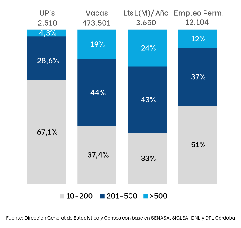 La mayor parte del rodeo lechero en Córdoba se encuentra en establecimientos de 201 a 500 vacas, seguido por los que tienen de 10 a 200 ejemplares. Entre ambos grupos, concentran el 81% del total de vacas lecheras en la provincia.