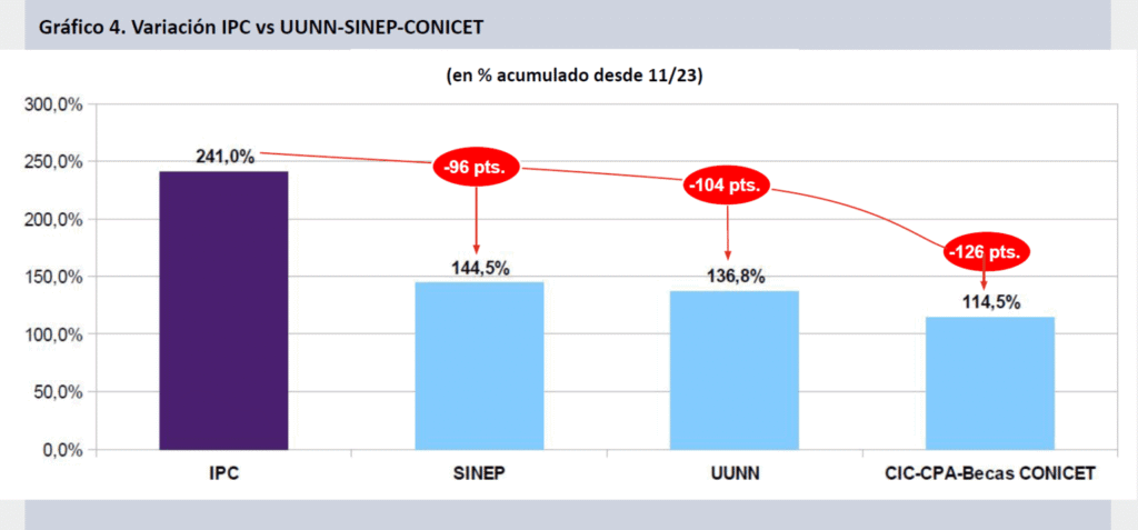 Desde la asunción de Javier Milei como Presidente de la Nación, la variación del índice de precios al consumidor alcanzó un 241%. En el mismo período, los trabajadores científicos del Sistema Nacional de Empleo Público (SINEP) se incrementaron un 144,5%, los salarios de los docentes e investigadores en Universidades lo hicieron un 136,8% y los del CONICET lo hicieron un 114,5%. Esto da cuenta de una enorme pérdida del poder adquisitivo de los salarios en el sector, que continuó su profundización en octubre.