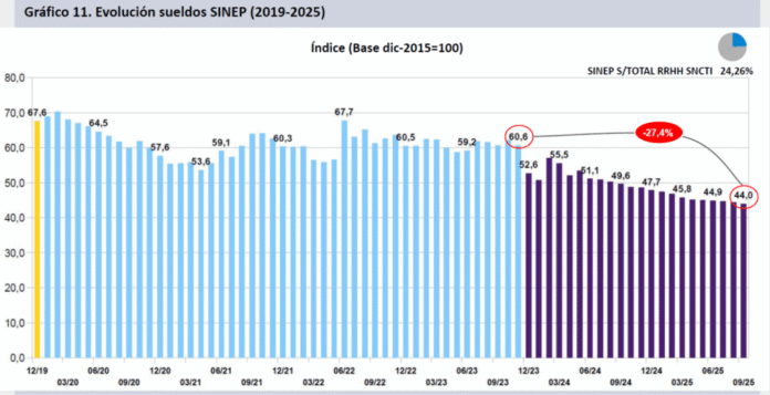 En segundo lugar, los salarios del personal encuadrado en el Sistema Nacional de Empleo Público declinaron un 0,9% en términos reales en el mismo periodo, de modo que ya acumulan una pérdida del 27,4% desde noviembre de 2023 y se encuentran un 56% por debajo del nivel que tenían en diciembre de 2015.