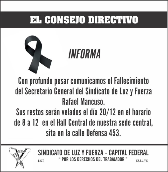 El secretario general del sindicato de Luz y Fuerza, Rafael Mancuso, falleció este viernes 19 de diciembre. La noticia fue confirmada por el Consejo Directivo del gremio, que expresó su pesar a través de un comunicado difundido en redes sociales.