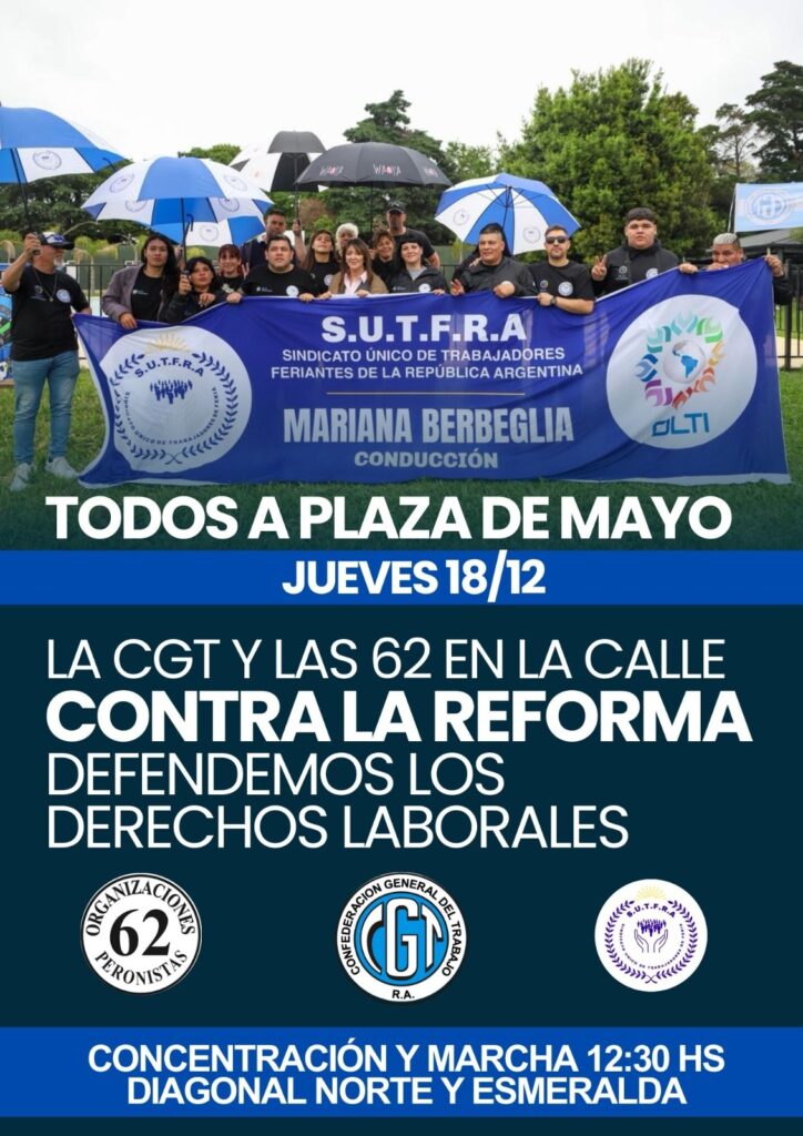 En el marco de su primer aniversario como organización sindical, el Sindicato Único de Trabajadores de Ferias de la República Argentina (SUTFRA) anunció su participación en la movilización del próximo 18 de diciembre, en lo que será además la primera marcha del gremio desde su conformación. La convocatoria tendrá lugar a las 12:30 horas en Diagonal Norte y Esmeralda.
