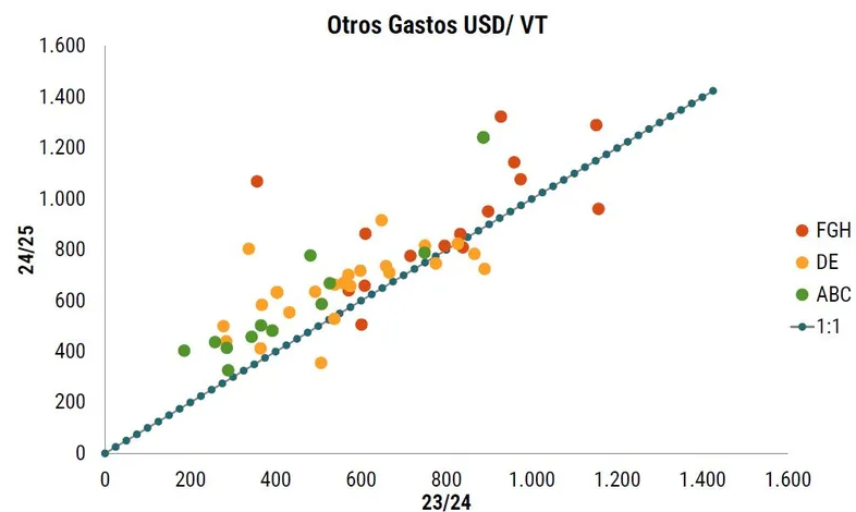 “Es importante que los mayores gastos registrados en la campaña 2024/25 explicados, en parte, por las buenas relaciones de precios, no genere un efecto inercial en 2025/26, el cual termine produciendo un aumento estructural de costos”, advierte.