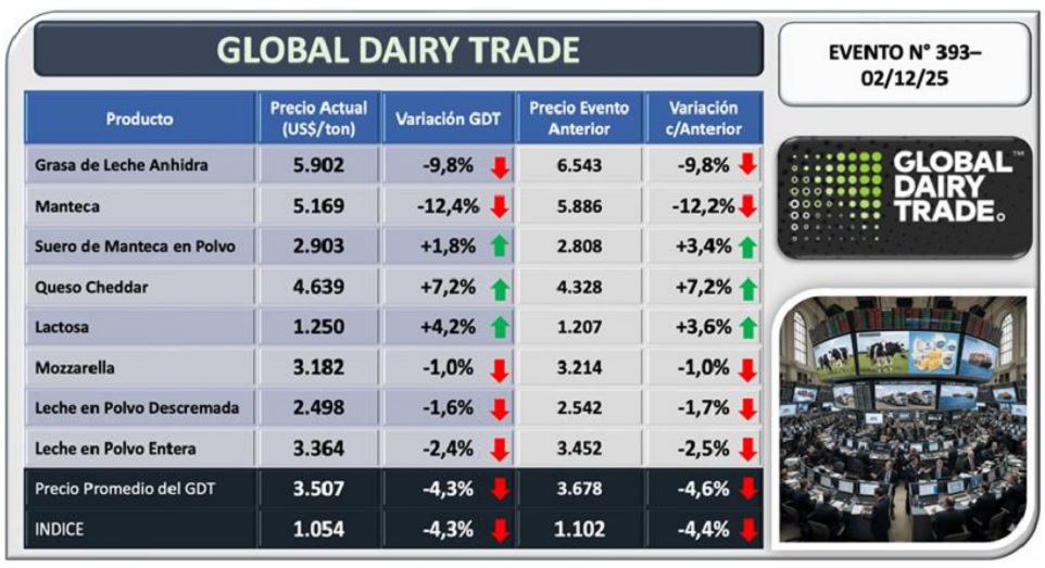La primera licitación de productos en el Global Dairy Trade de diciembre 2025, marcó un precio promedio de los productos comercializados de 3.507 dólares por tonelada, lo que representa una caída del 4,3 % en el índice de precios. La leche en polvo entera promedió los 3.364 dólares.