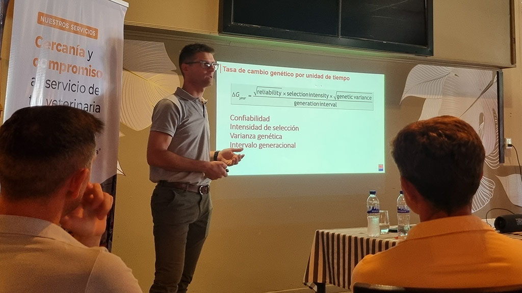El médico veterinario Gastón Uslenghi, gerente de Servicios Técnicos y Genéticos de ABS Argentina, fue el encargado de aportar a través de una charla titulada “Mejoramiento genético 2.0” todos los detalles del seguimiento genómico que componen esta estrategia y puntualmente detalló de qué se trata GeneAdvance, un plan genético que incluye la evalucación genómica para ser más eficientes ranqueando hembras, con 85% de probabilidad, ayudando a validar el progreso y la toma de decisiones.
