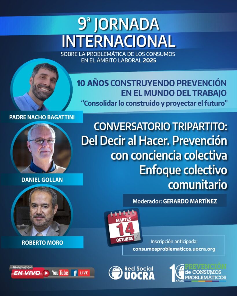 El encuentro se llevará a cabo el martes 14 de octubre en el Espacio Cultural UOCRA bajo el lema “Consolidar lo construido y proyectar el futuro”. Participarán especialistas nacionales e internacionales, representantes de organismos públicos y religiosos, y autoridades sindicales encabezadas por Gerardo Martínez.