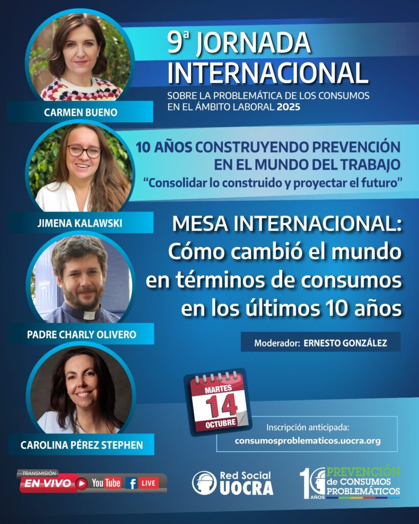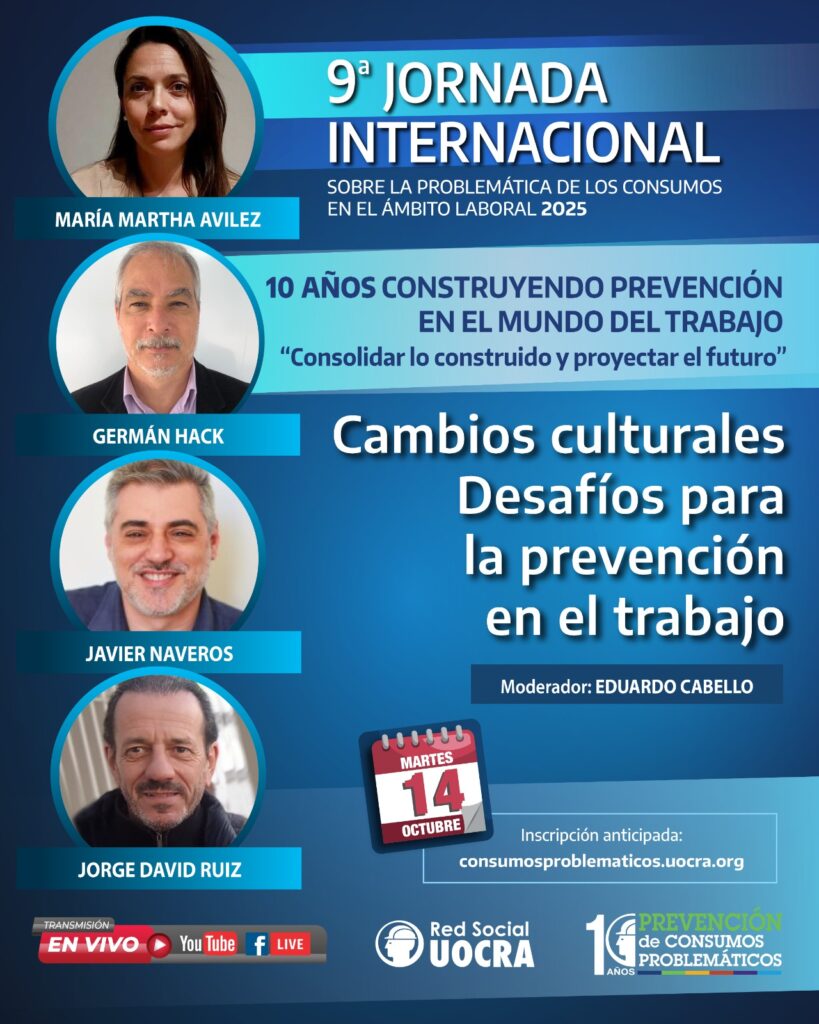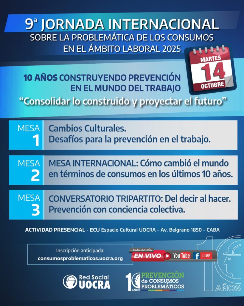 La Unión Obrera de la Construcción de la República Argentina (UOCRA) realizará el próximo martes 14 de octubre la 9ª Jornada Internacional sobre la problemática de los consumos problemáticos en el ámbito laboral, una iniciativa organizada por su Equipo Multidisciplinario de Prevención, coordinado por la Lic. Alejandra Hurwitz y el Dr. Gustavo Calderón.