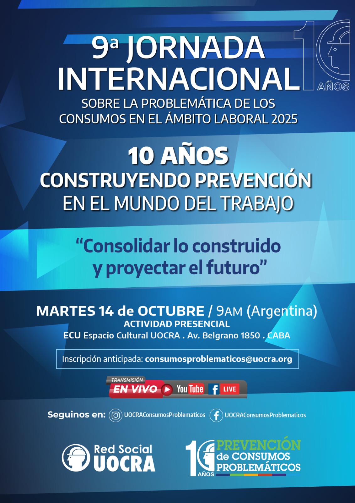 La Unión Obrera de la Construcción de la República Argentina (UOCRA) realizará el próximo martes 14 de octubre la 9ª Jornada Internacional sobre la problemática de los consumos problemáticos en el ámbito laboral, una iniciativa organizada por su Equipo Multidisciplinario de Prevención, coordinado por la Lic. Alejandra Hurwitz y el Dr. Gustavo Calderón.