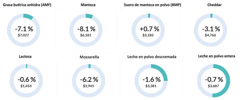 El valor promedio para todos los productos cerró en -3.4%, cayendo a U$S4.228 por tonelada. En lo que respecta a la leche en polvo, la entera tuvo un leve descenso, del 0.7% y la descremada del 1.6, cerrando en U$S3.687 y U$S3.381 las toneladas, respectivamente.