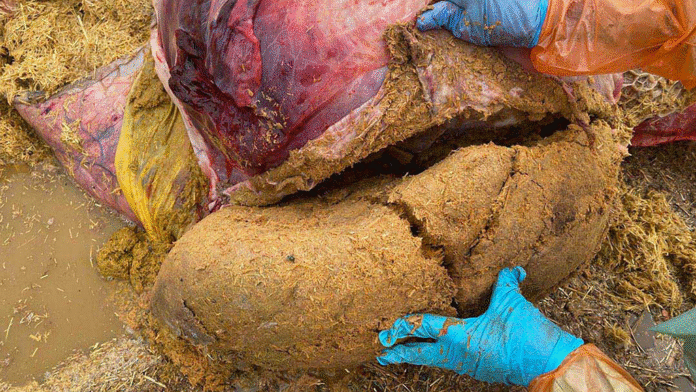 Molde de paja del interior de un cuajar de una vaca muerta por impactación de cuajar